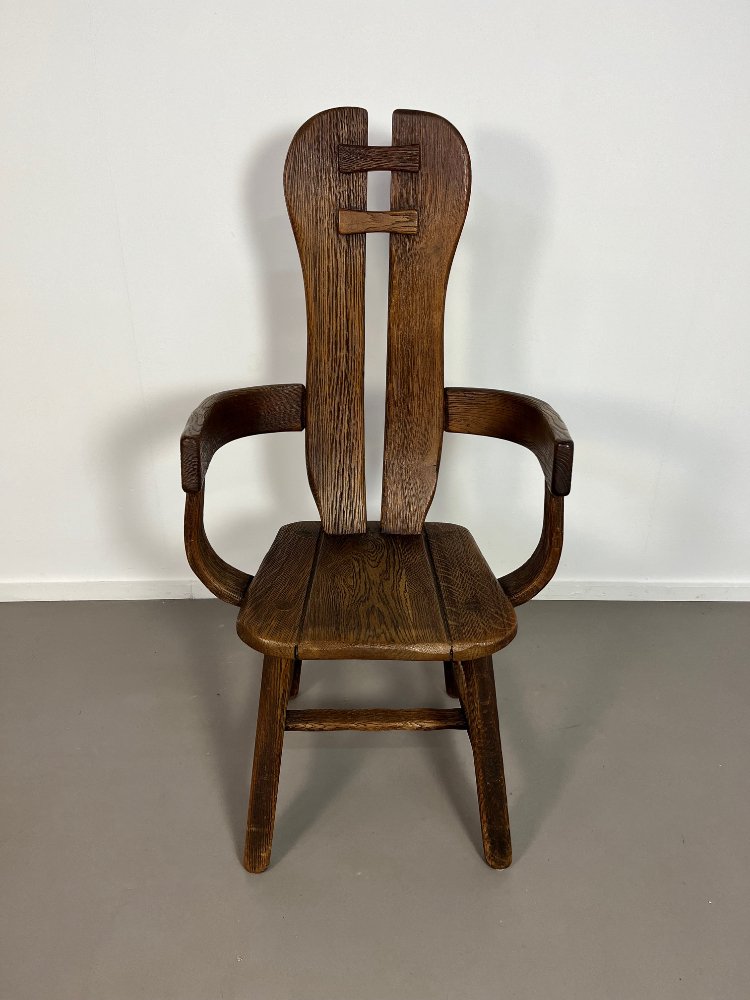20th-century brutalist oak armchair 1960s.The chair has a beautiful dark brown patina.Manufactured by Kunstmeubelen De Puydt, Belgium.