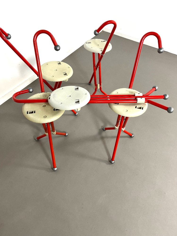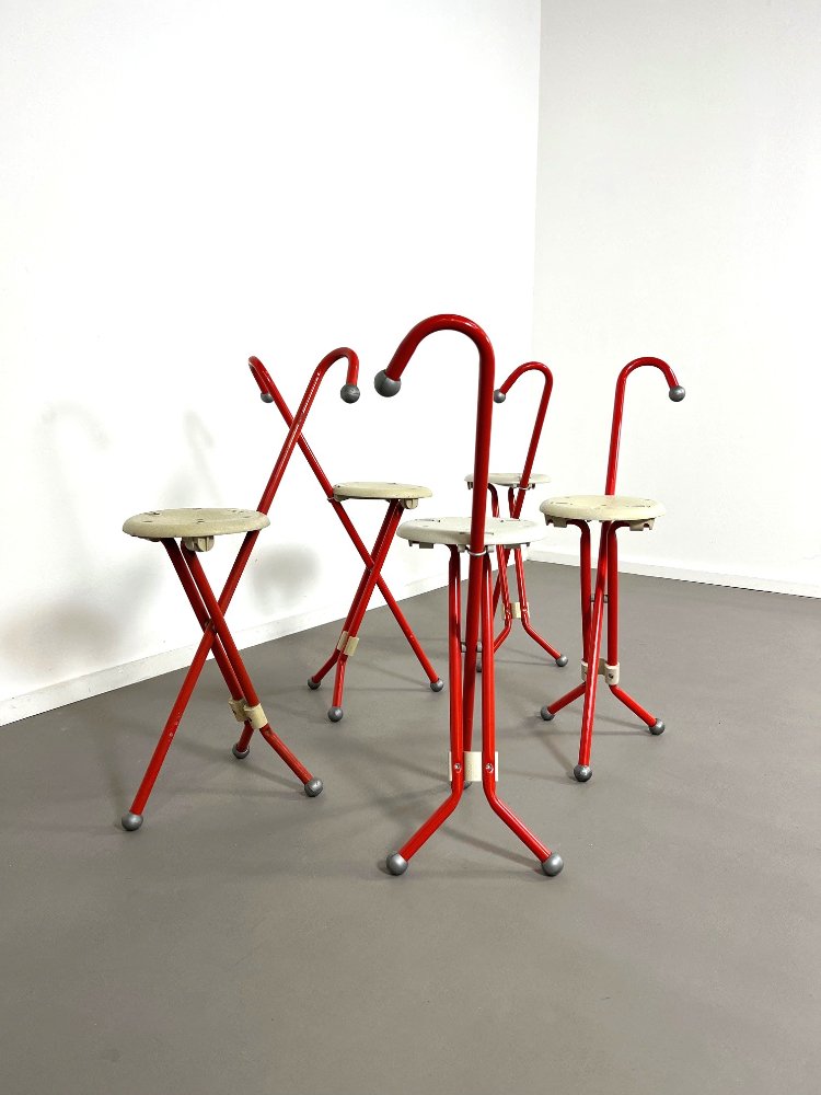 The foldable chairs have a red lacquered metal frame and a plastic seat, when folded they can be used as a walking stick.
