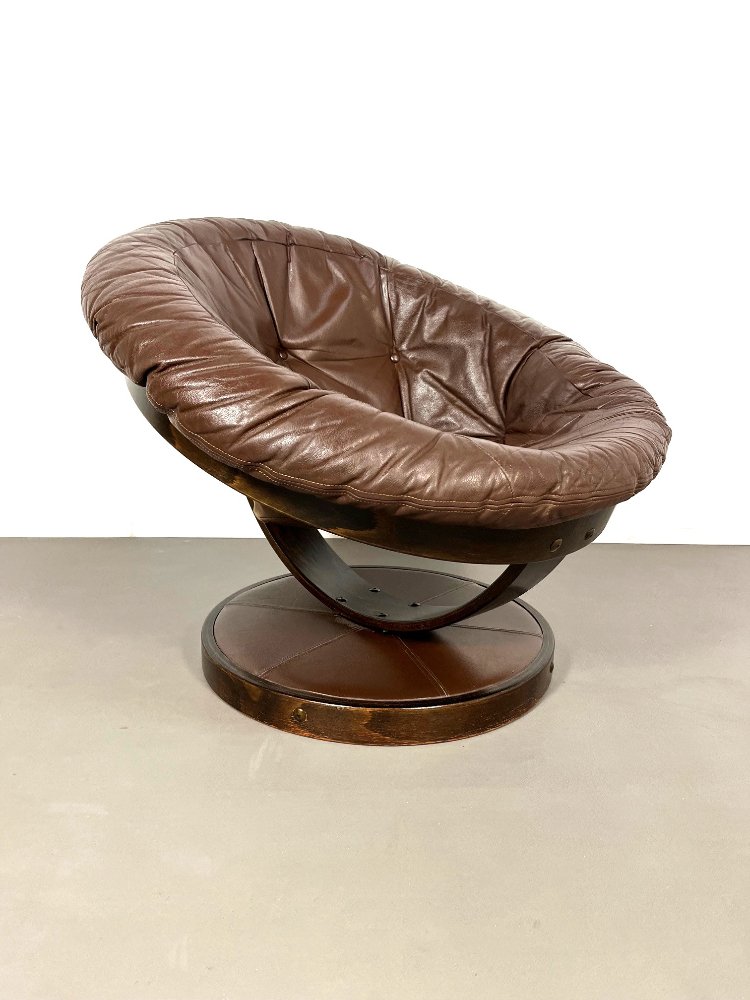 Rare 20th-century vintage design lounge chair, 1970.The chair has a rotatable wooden base with a brown leather seat.