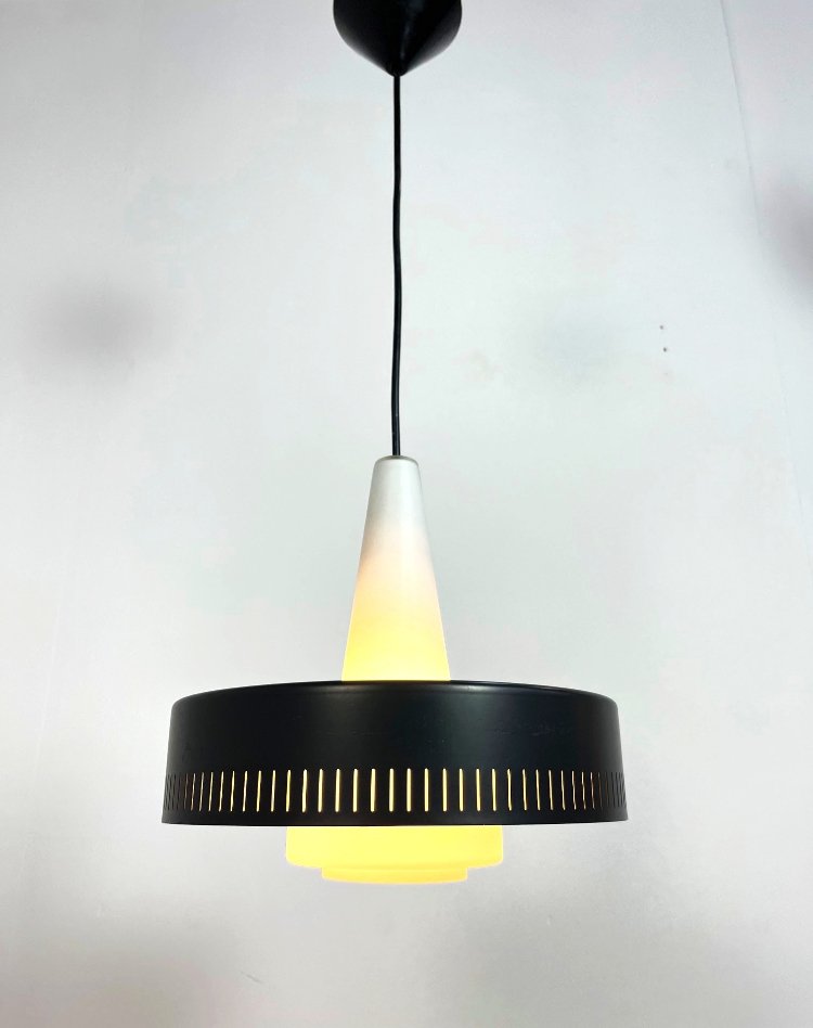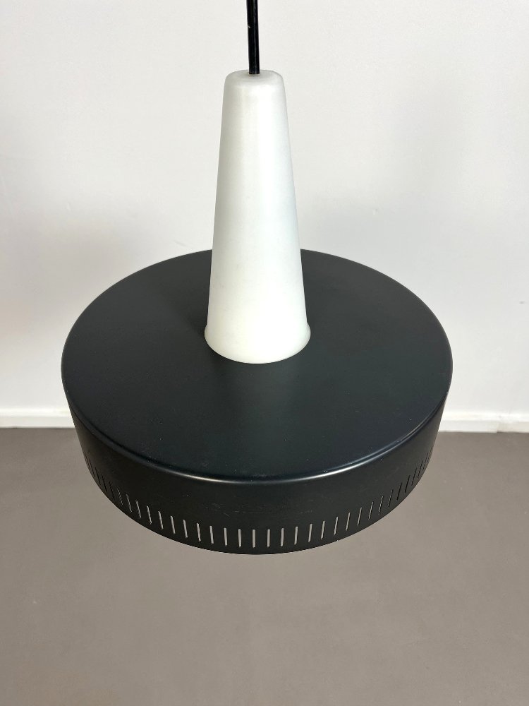 The lamp features a heavy, gray metal shade with a small rust spot inside, which is not disturbing, and an opaline glass shade.