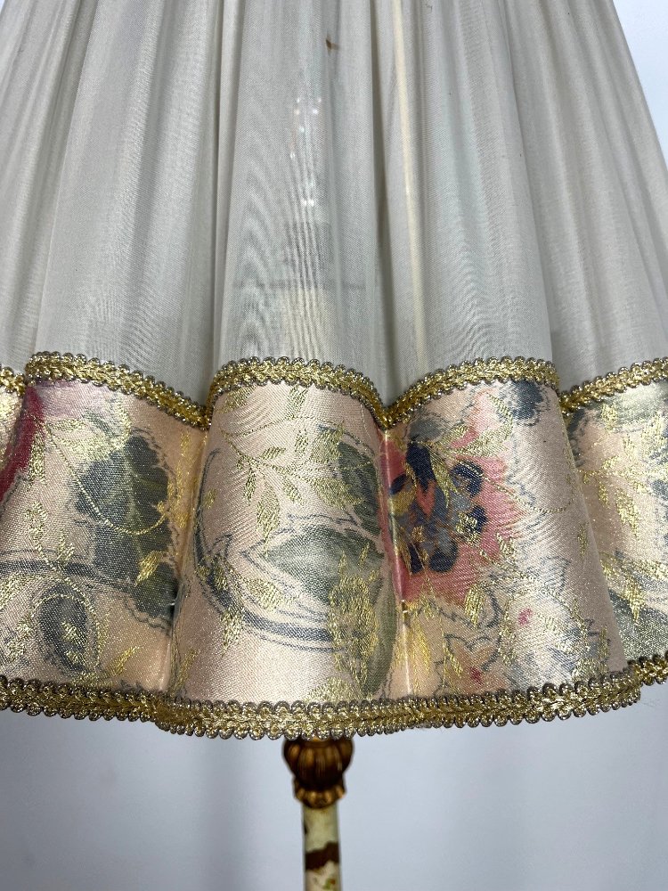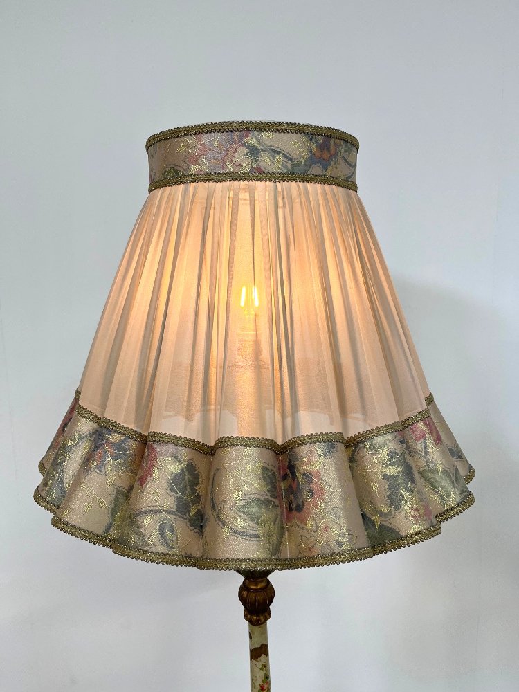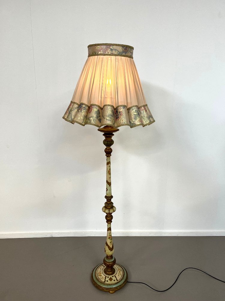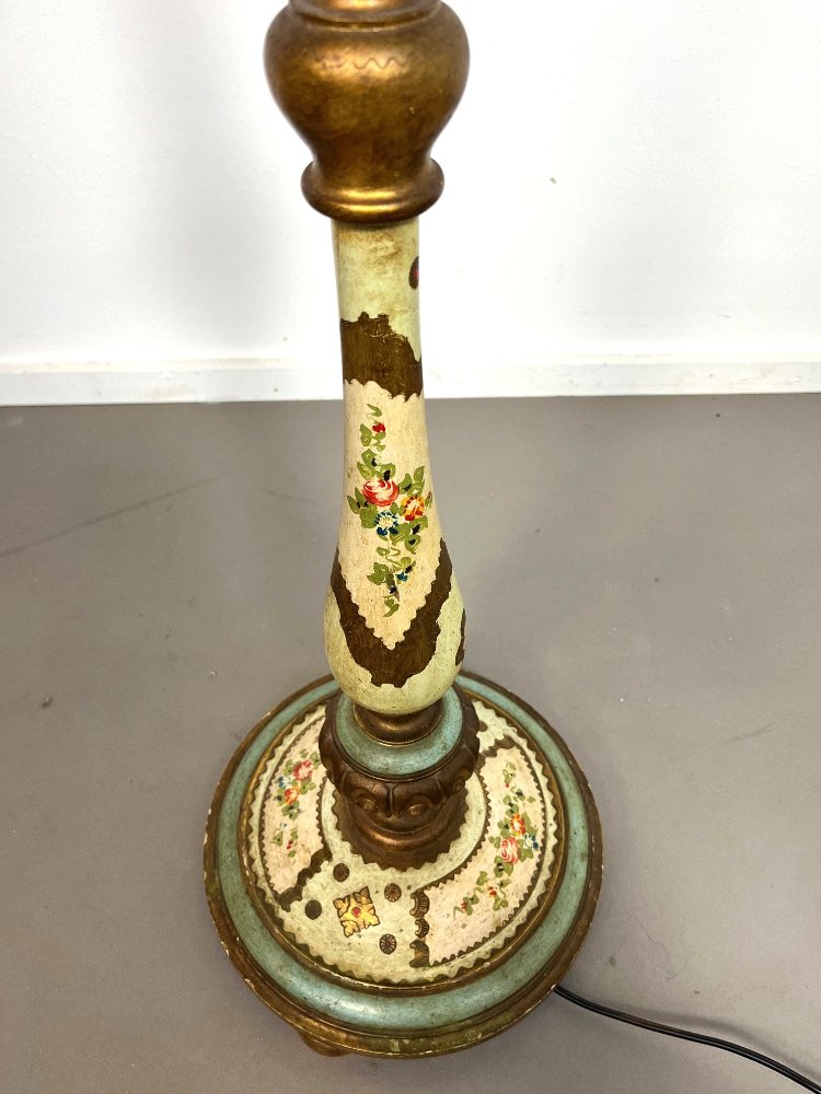 Beautiful 20th-century carved and hand-painted wooden Italian Florentine floor lamp, 1950s. The lamp has its original shade and has been rewired. Manufactured in Italy.