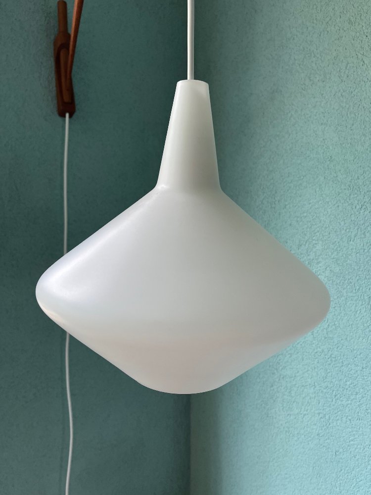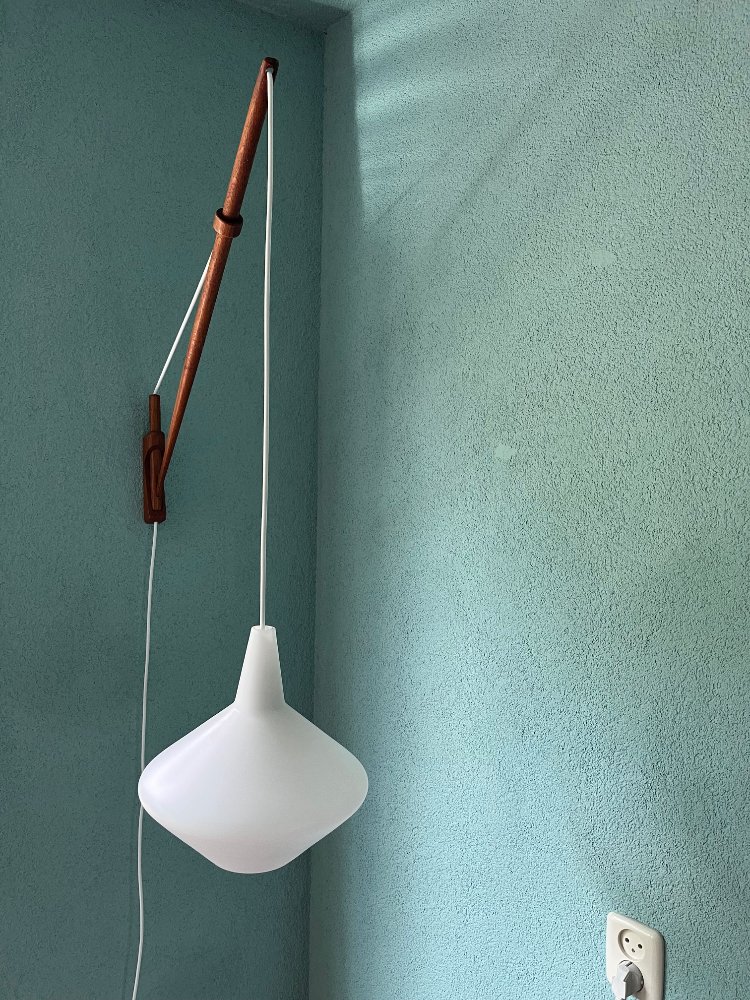 The frosted glass shade hangs on an ingenious way of using balance and weight on a teak stem in a teak wall mount.