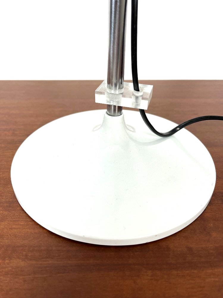The lamp has three light sources, a white plexiglass shade, a metal white base, and is adjustable in height.