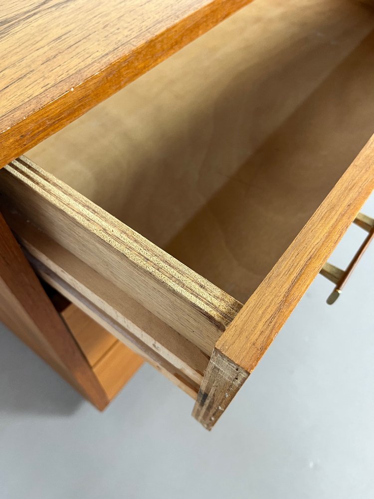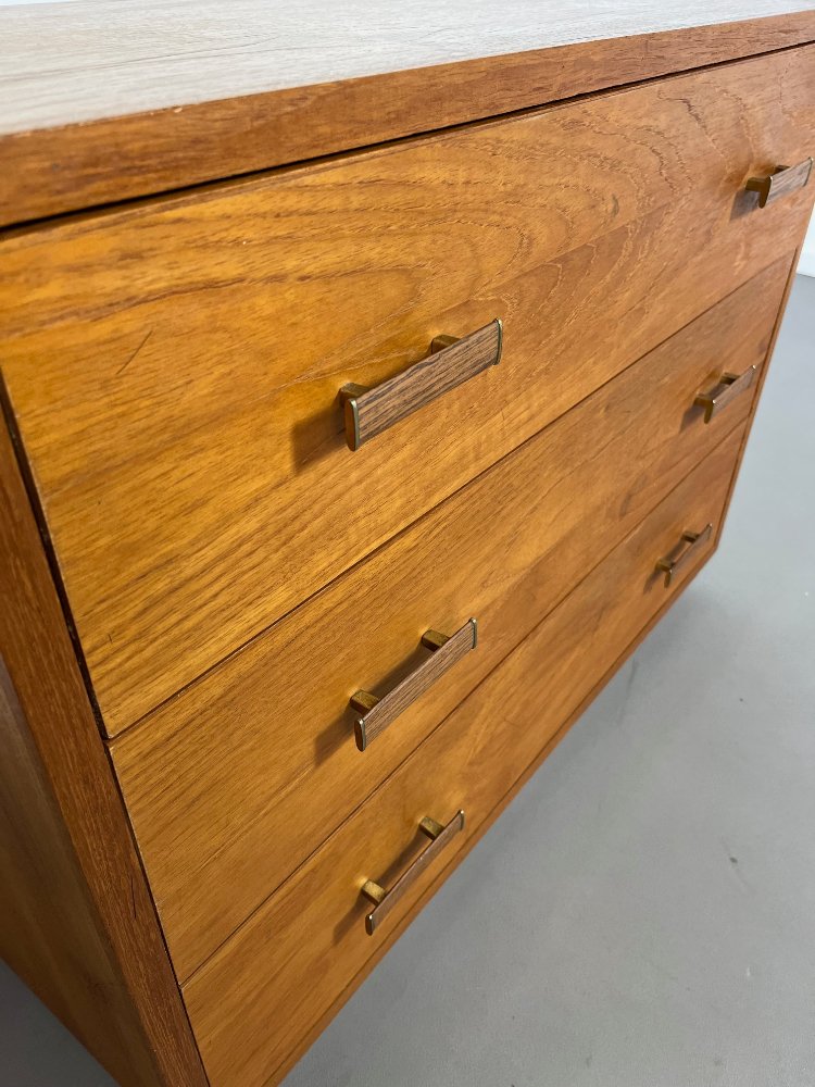 20th-century vintage design teak chest of drawers, ca 1960.The chest has 3 drawers with beautifully designed teak handles.Manufactured in Denmark.
