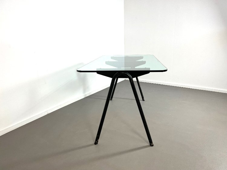 20th-century industrial desk, 1960. The desk, or small dining table, has a black metal frame and a glass top. The glass top is 1.5 cm thick. Manufactured in France.