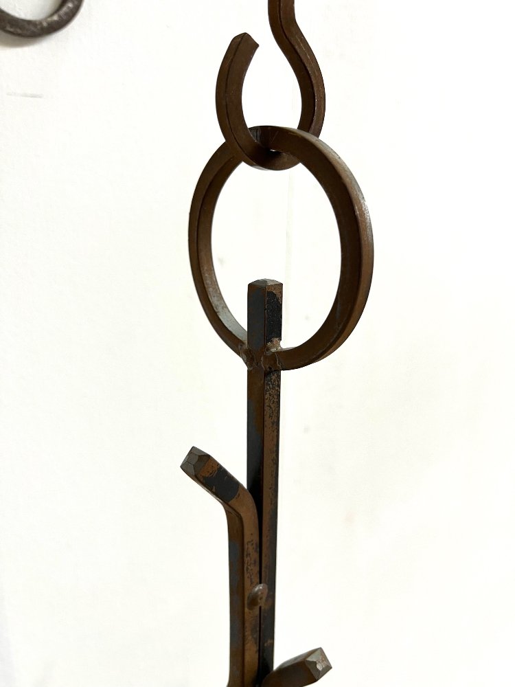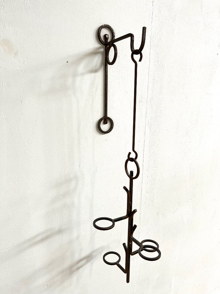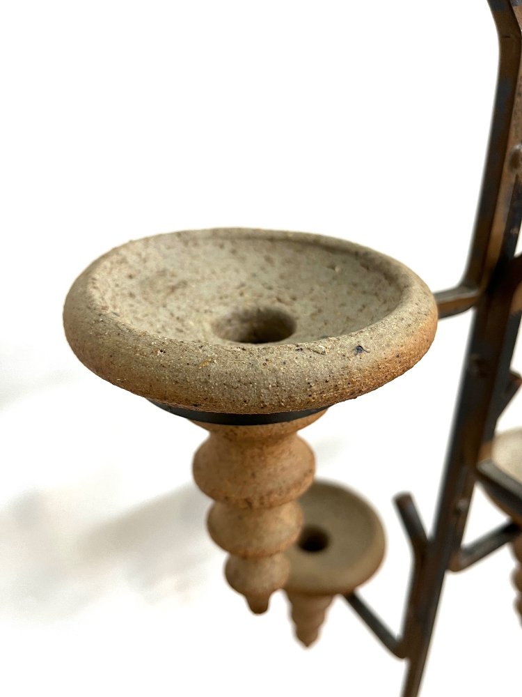 20th-century brutalist wrought iron wall hanger with stoneware candle holders, ca 1960.
