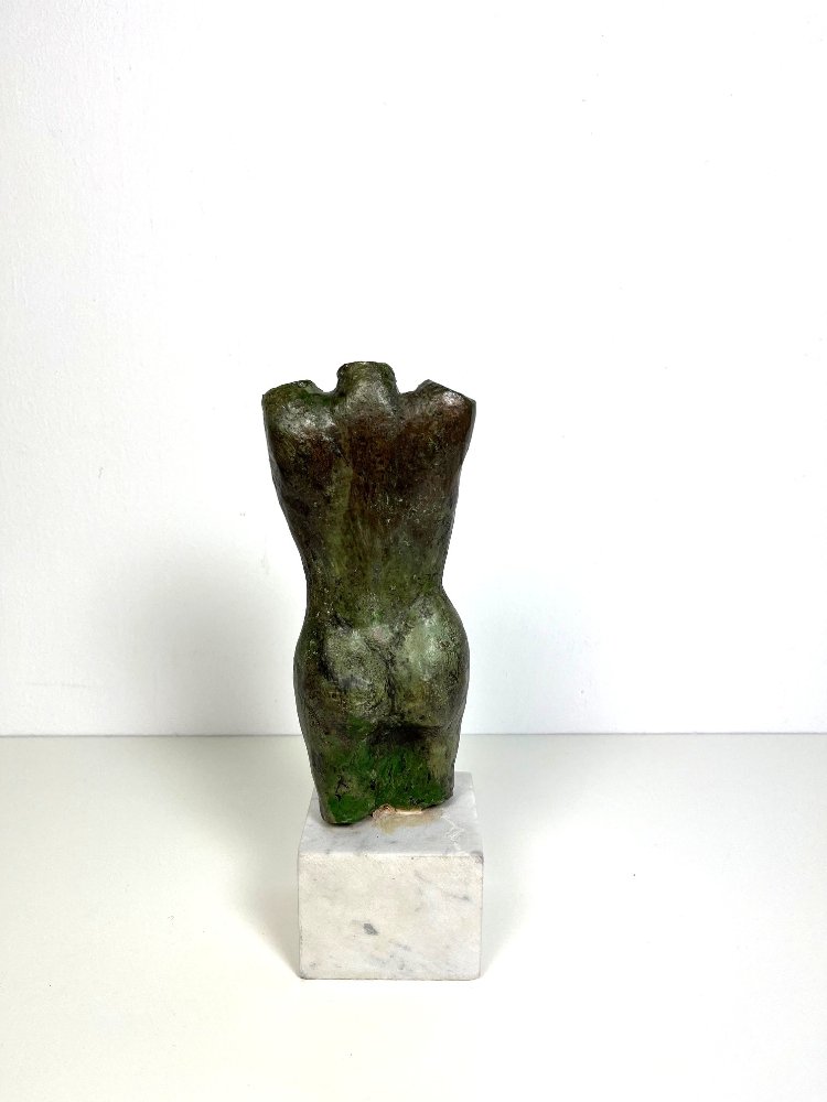 Beautiful patinated bronze female torso on a small marble base.Manufactured by Marianne Frijling, the Netherlands.