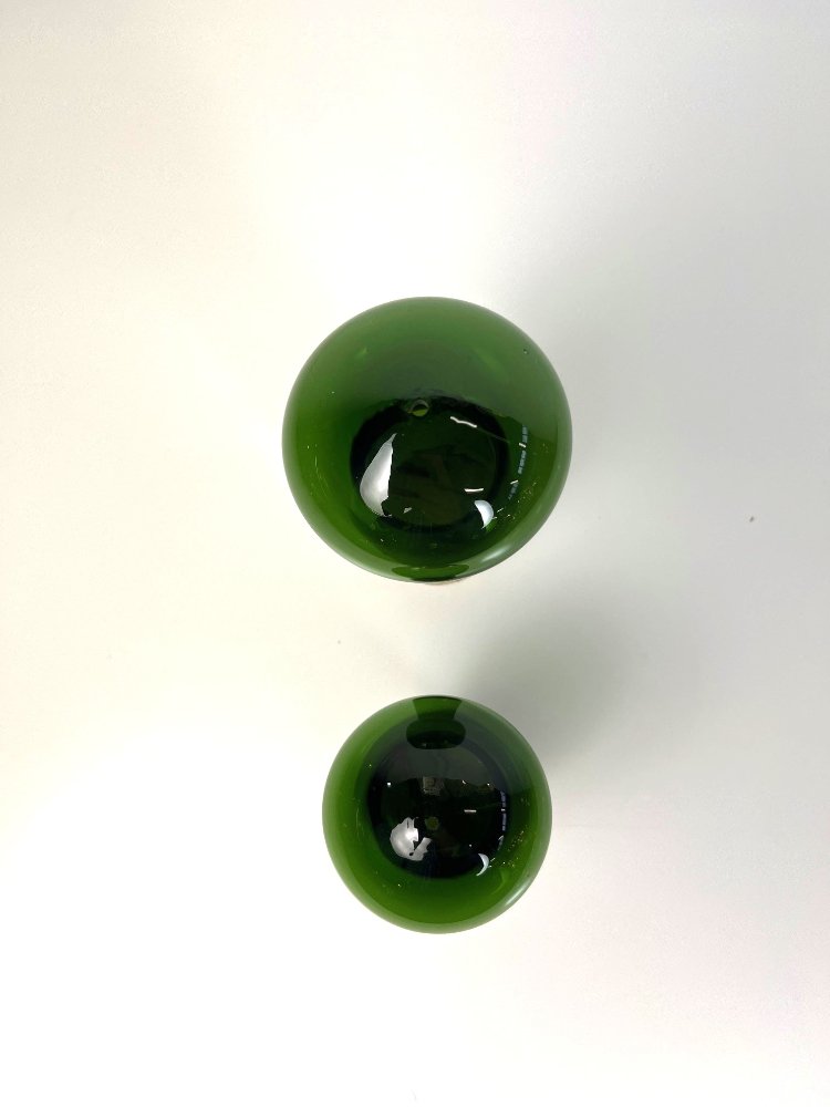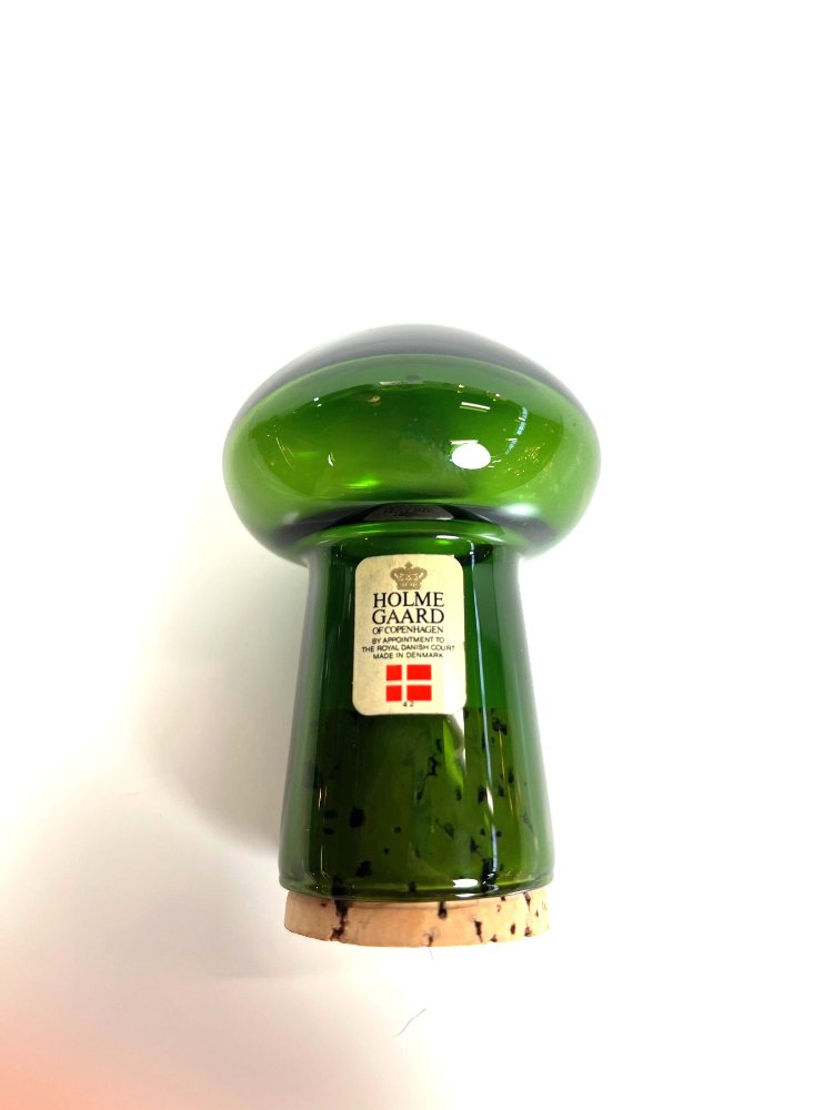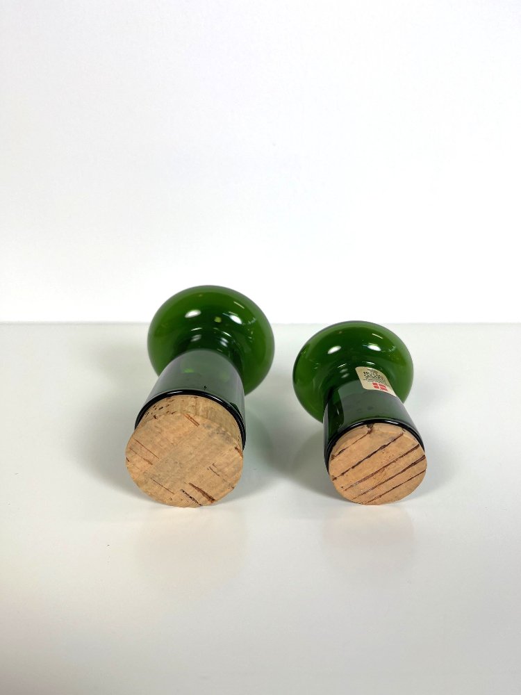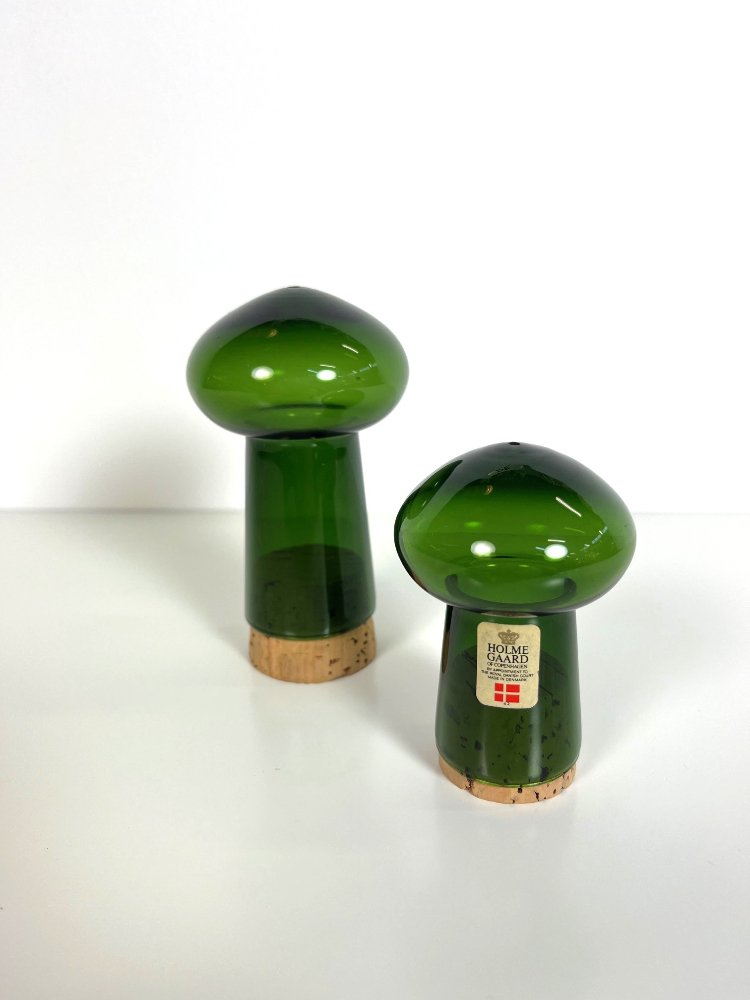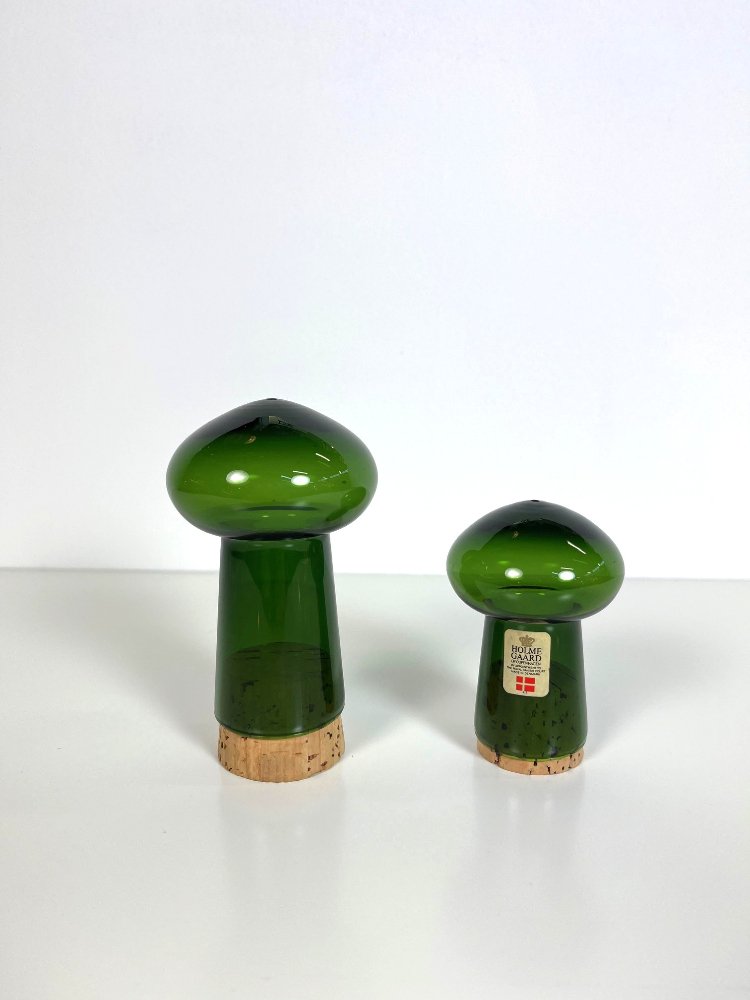 Handblown vintage design green mushroom-shaped glass salt & pepper set, ca 1970. One of the two is marked with a Holmegaard sticker. Designed by Jacob Bang. Manufactured by Holmegaard, Denmark.