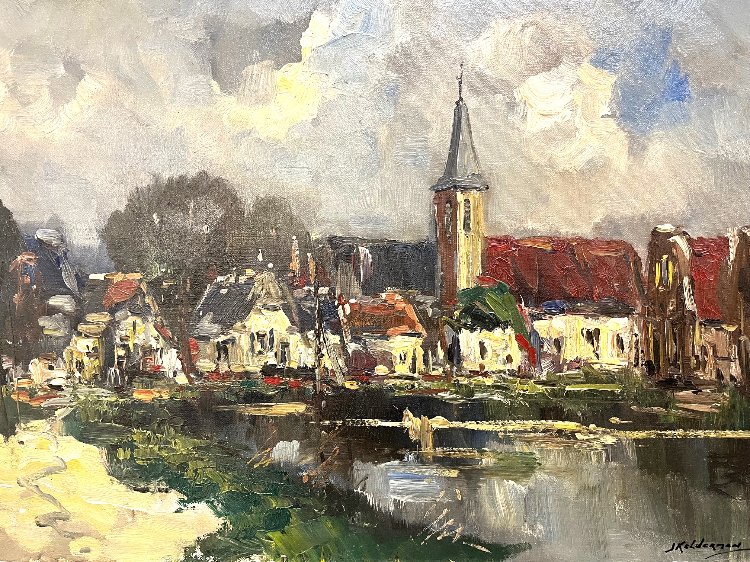 Dutch Impressionist oil painting of a village scene.Manufactured by Jan Kelderman (Edam 1914-Amsterdam 1990)